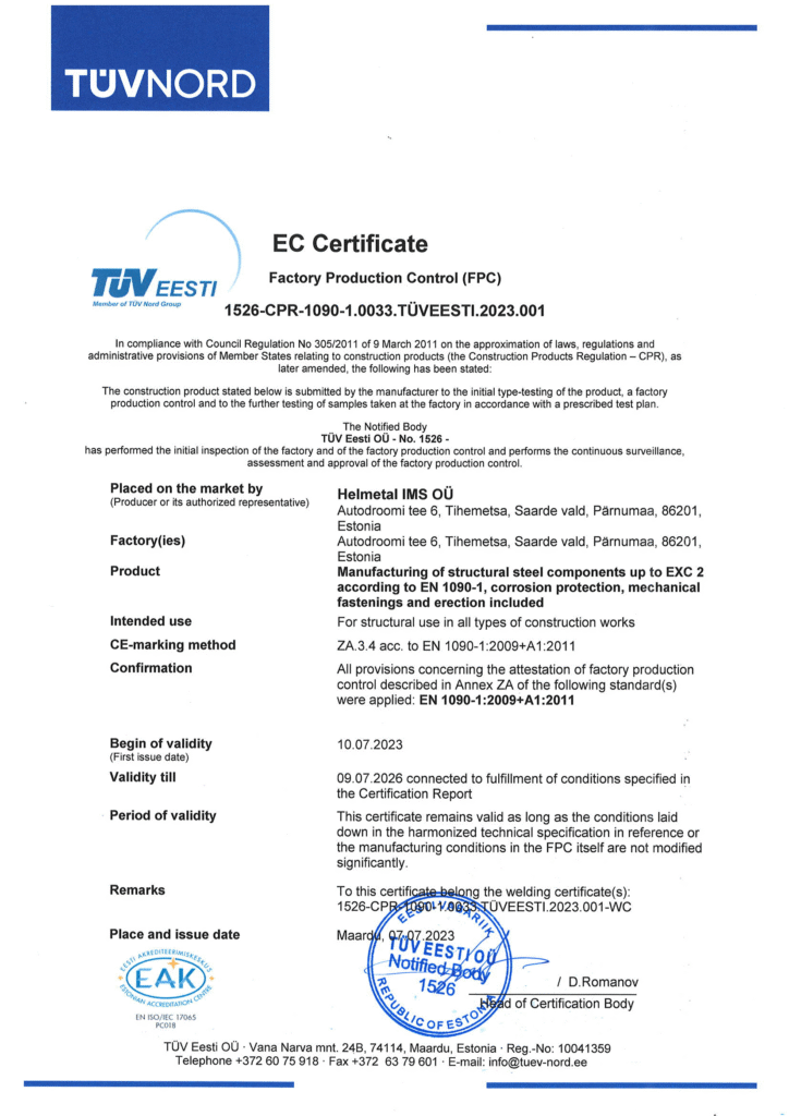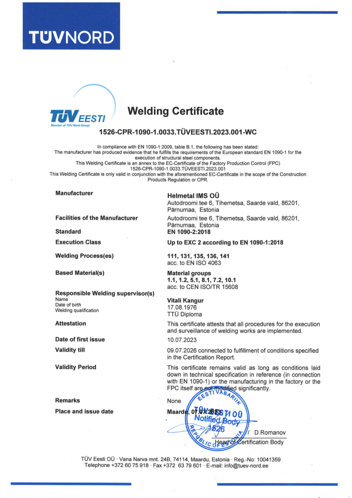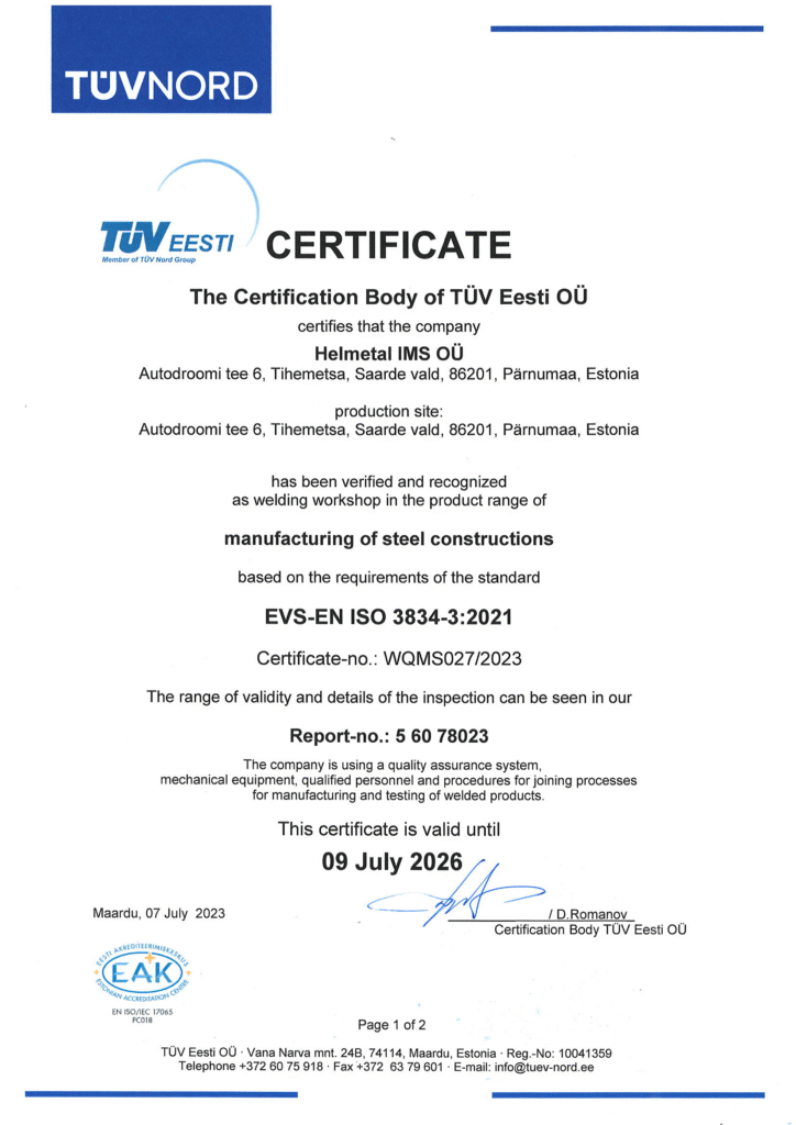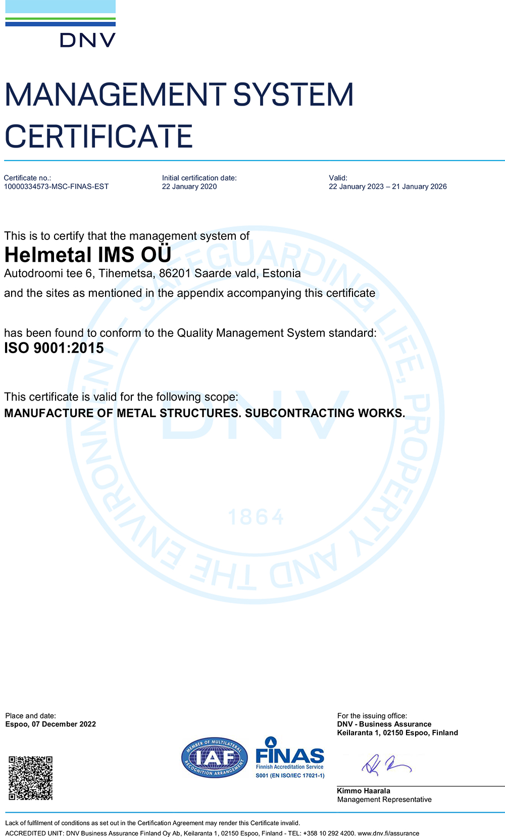 Yritys on sertifioitu EN ISO 1090-1, EN ISO 9001 ja EN ISO 3848-3 mukaisesti.